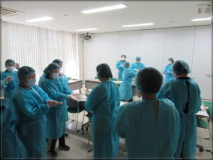 不織布ガウンの着脱の訓練をしました。