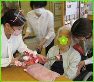 とあるユニットでは、ご入居者お一人おひとりへお花のプレゼントもありました。