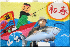 漁師さんが手にする釣り竿は職員の持ち物を、