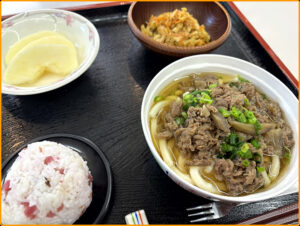具材たっぷりの肉うどん(おにぎりつき)で身体が温まりました。